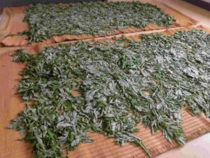 ☆よもぎ摘み☆R7.5月 2025年5月25日 しぶみの家の利用者が、通所の途中の道路沿いにヨモギを見つけ、 「ヨモギがいっぱい出てきたよ。」と教えてくれたので、さっそく 天気のいい日をねらってよもぎを摘みました。 摘み取った葉は、天日で干してカラカラの状態にして、『よもぎ枕』の 原料にします。